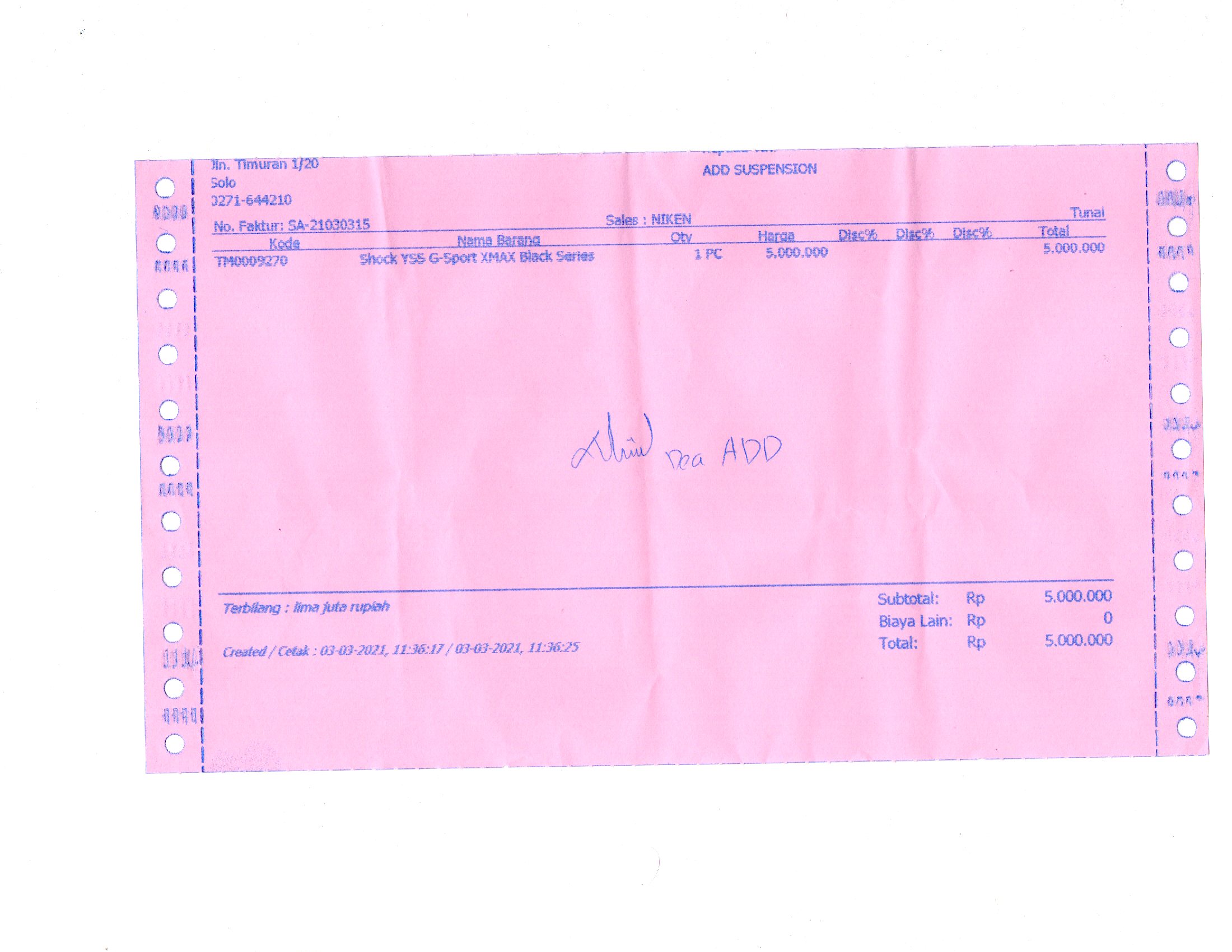 | 1 Sets | YSSSGS001 Shock G-Sport XMAX BLACK SERIES (Sets) | Rp. 5,000,000 | Rp. 5,000,000 | - | - | Rp. 5,000,000 |