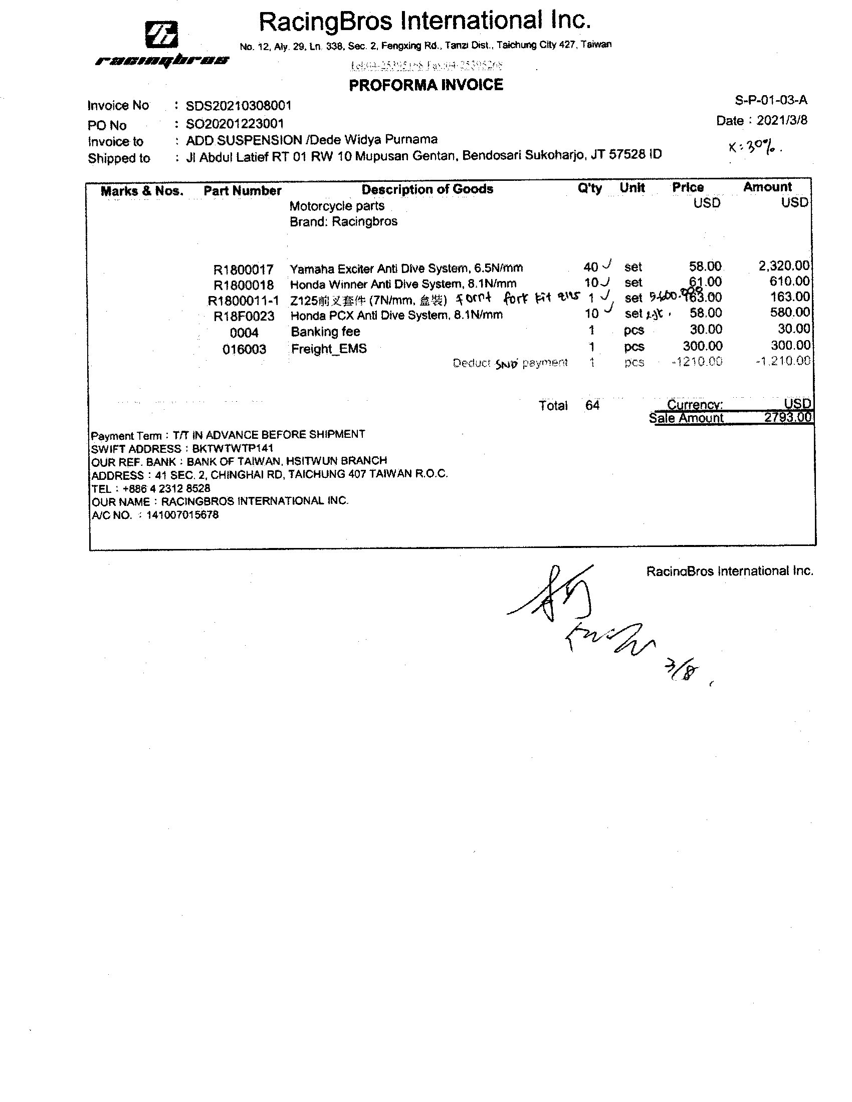 Racing bros International Inc 41 SEC.2 ,CHINGHAI RD, TAICHUNG 407 TAIWAN R.O.C ,