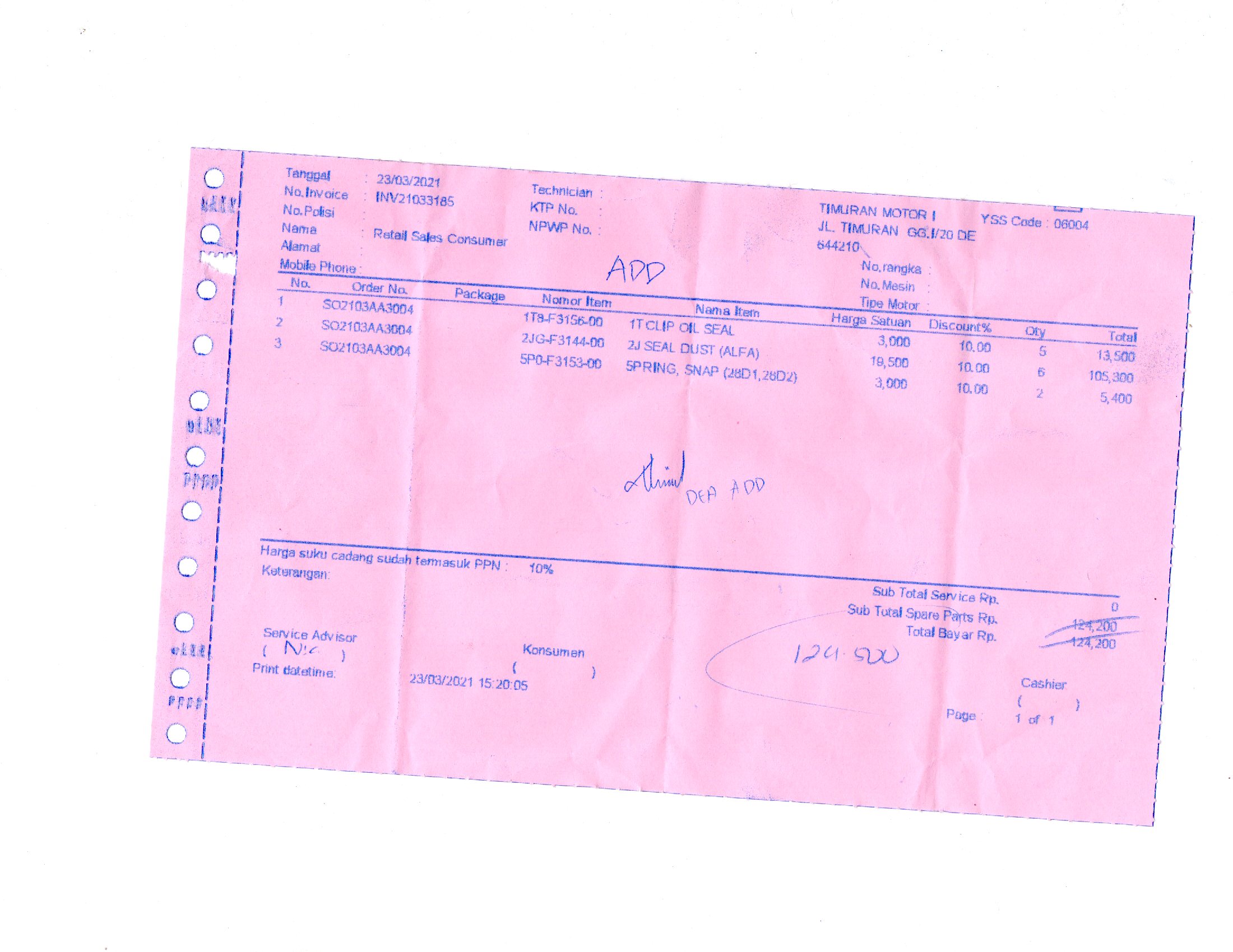 | 5 Pcs | YMHCOS001 Clip Oil Seal - (Pcs) | Rp. 3,000 | Rp. 15,000 | 10 % | Rp. 1,500 | Rp. 13,500 |
