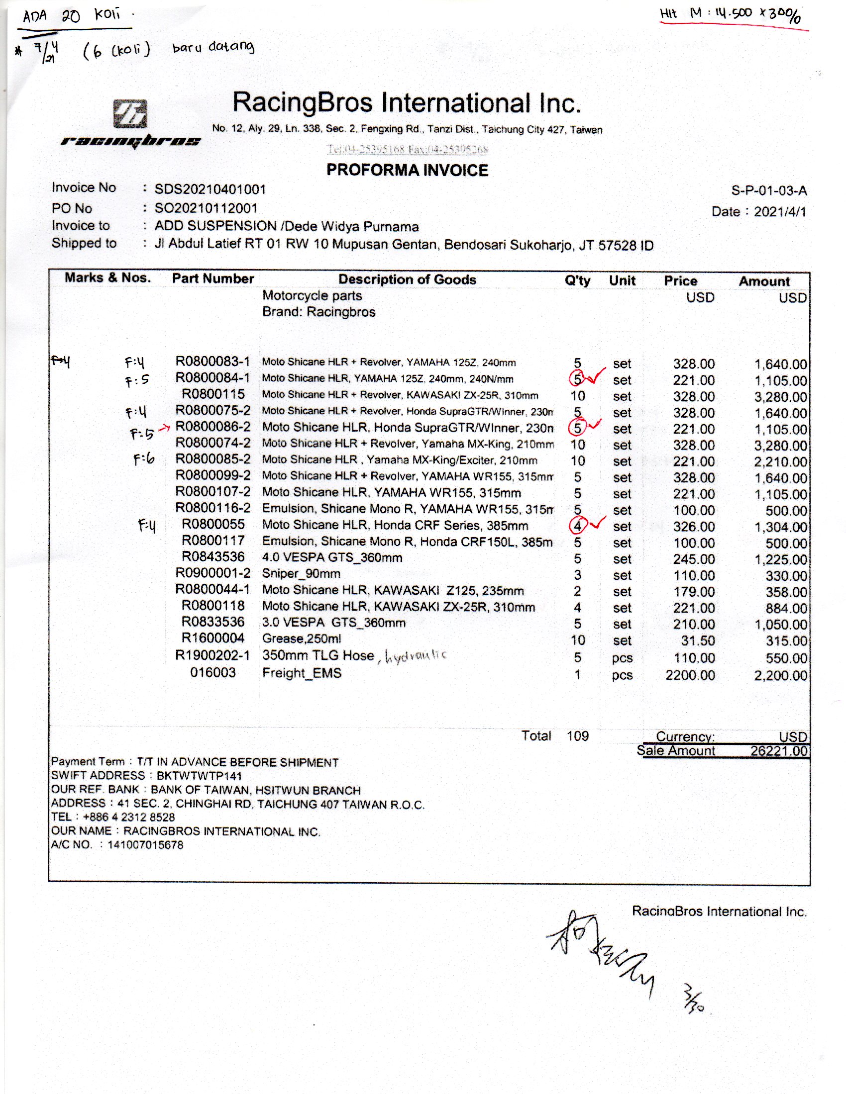 Racing bros International Inc 41 SEC.2 ,CHINGHAI RD, TAICHUNG 407 TAIWAN R.O.C ,