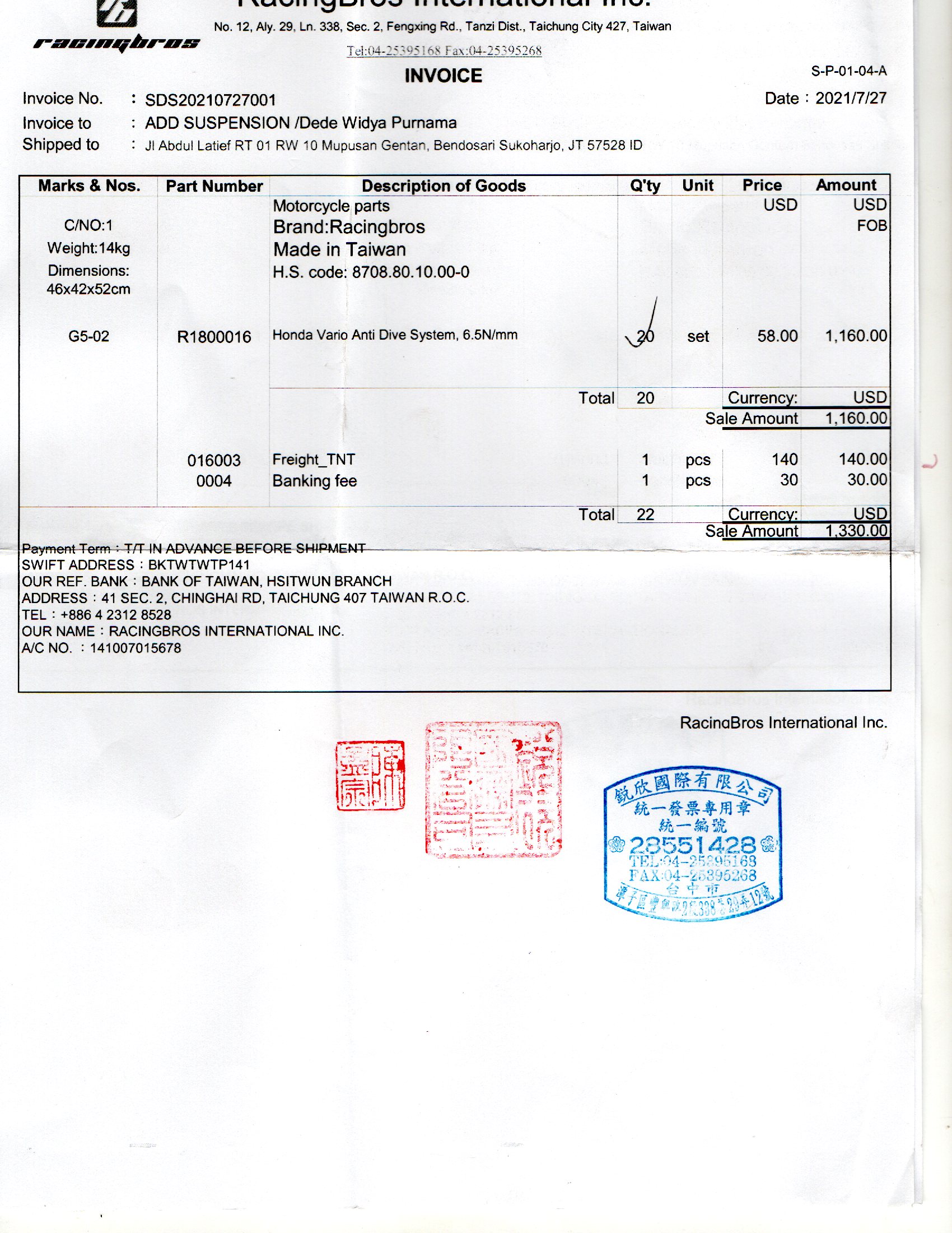 Racing bros International Inc 41 SEC.2 ,CHINGHAI RD, TAICHUNG 407 TAIWAN R.O.C ,