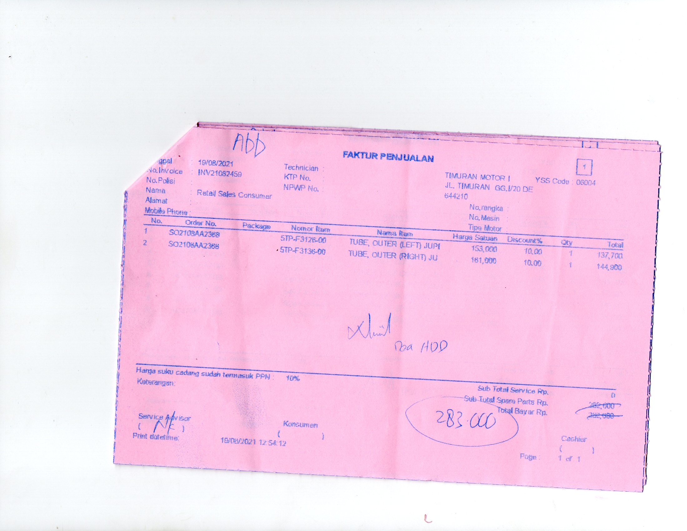 | 1 Sets | YMHTOL002 TUBE OUTER LEFT (Sets) | Rp. 153,000 | Rp. 153,000 | 10 % | Rp. 15,300 | Rp. 137,700 |