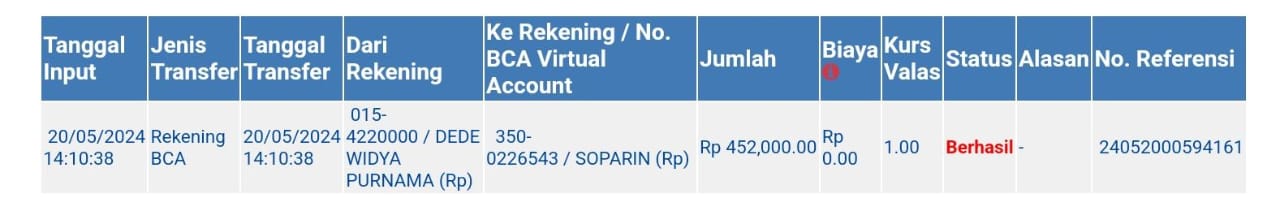 | 1 | 20-05-2024 14:14 | PELUNASAN | Rp. 452,000 | Rp. 0 | Rp. 452,000 | BCA | Download |