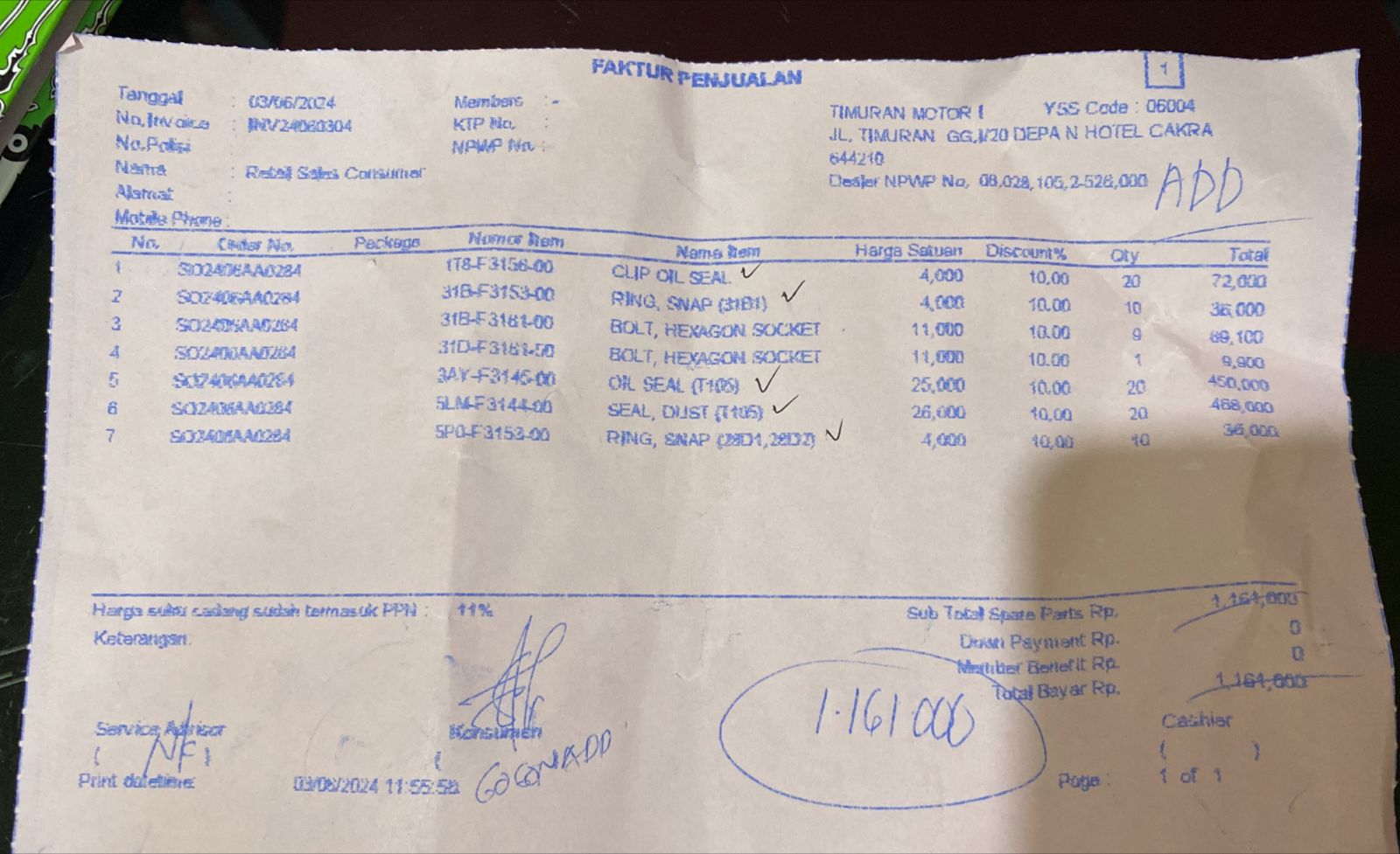 JumlahKode BarangHarga SatuanTotal HargaJumlah PotonganTotal PotonganTotal Bayar