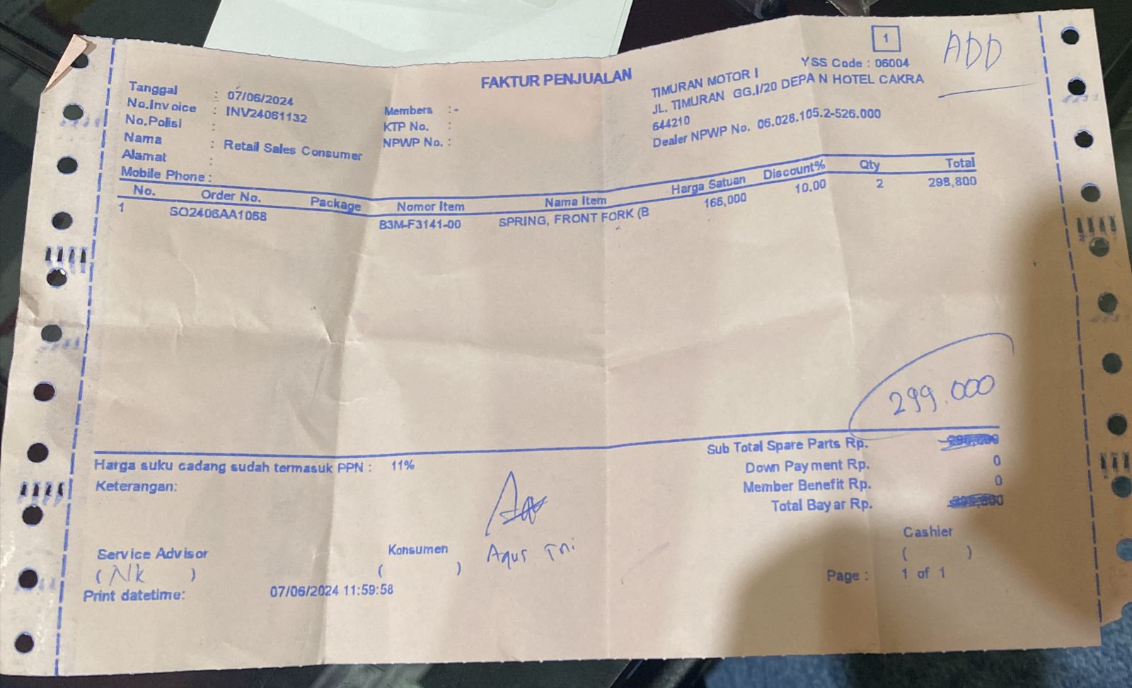 | 2 Pcs | ADDSFF001 Spring Front Fork - (Pcs) | Rp. 166,000 | Rp. 332,000 | 10 % | Rp. 33,200 | Rp. 298,800 |