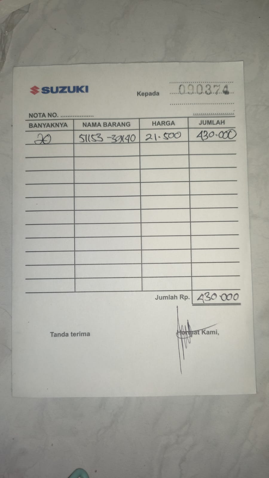 | 20 Sets | ADDOSSGP01 OIL SEAL 51153-39140-000 (Sets) | Rp. 21,500 | Rp. 430,000 | - | - | Rp. 430,000 |