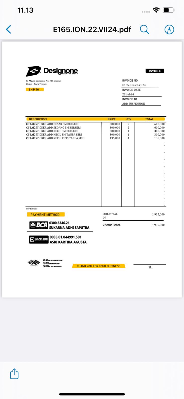 | 1 Pcs | ADDSTCB001 Sticker besar - (Pcs) | Rp. 135,000 | Rp. 135,000 | - | - | Rp. 135,000 |