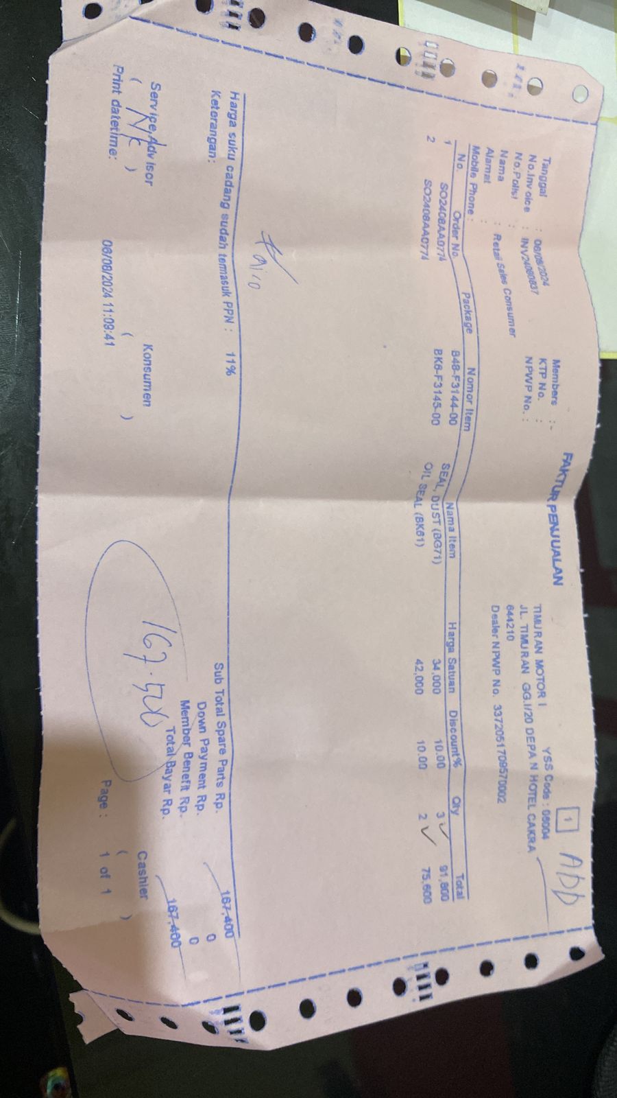 | 3 Pcs | ADDSDR001 SEAL, DUST (BG71) YZF155 / YZF250 (Pcs) | Rp. 34,000 | Rp. 102,000 | 10 % | Rp. 10,200 | Rp. 91,800 |