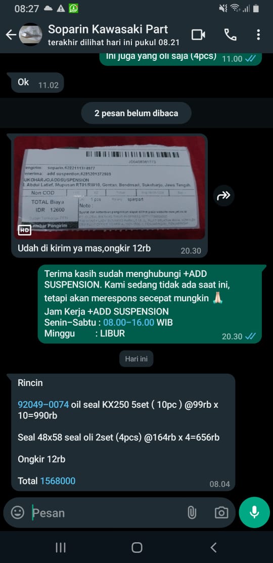 | 4 Pcs | KWSOS001 Oil Seal KX250/KX250F (2013-2019) - (Pcs) | Rp. 164,000 | Rp. 656,000 | - | - | Rp. 656,000 |