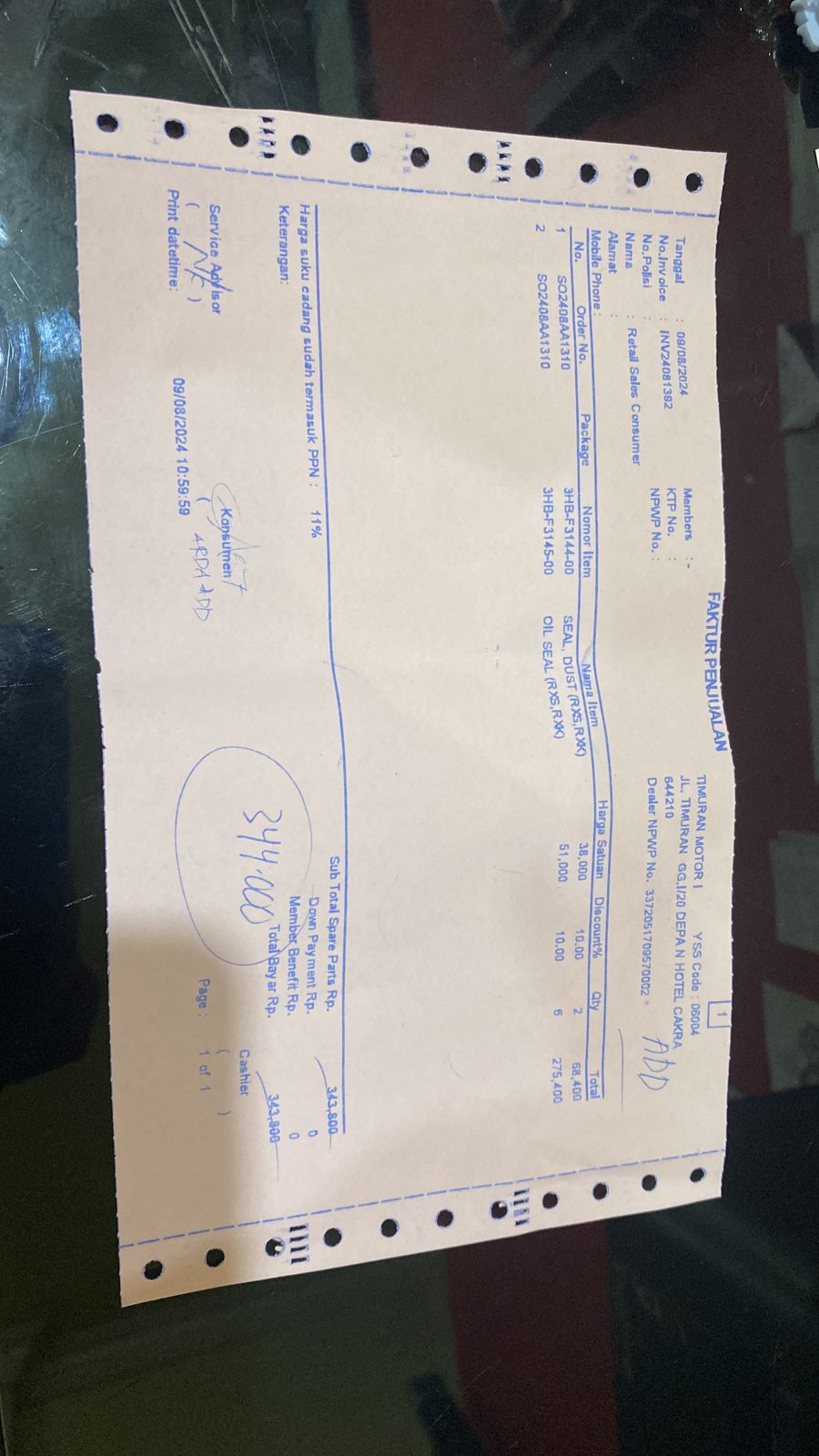 | 6 Pcs | ADDOS001 OIL SEAL (RXS,RXK) - (Pcs) | Rp. 51,000 | Rp. 306,000 | 10 % | Rp. 30,600 | Rp. 275,400 |