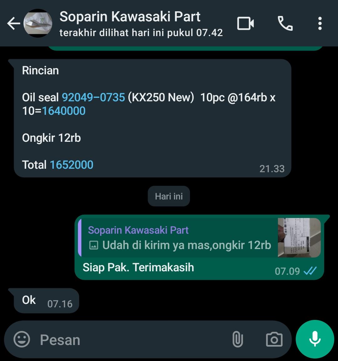 | 10 Pcs | KWSOS001 Oil Seal KX250/KX250F (2013-2019) - (Pcs) | Rp. 164,000 | Rp. 1,640,000 | - | - | Rp. 1,640,000 |