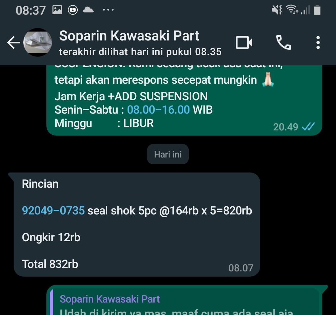| 5 Pcs | KWSOS001 Oil Seal KX250/KX250F (2013-2019) - (Pcs) | Rp. 164,000 | Rp. 820,000 | - | - | Rp. 820,000 |
