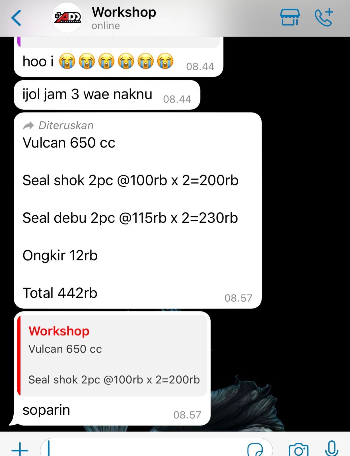 | 2 Pcs | KGP920931472 SEAL,FORK OUTER TUBE (dust seal) ER650 / EN650 (Pcs) | Rp. 100,000 | Rp. 200,000 | - | - | Rp. 200,000 |
