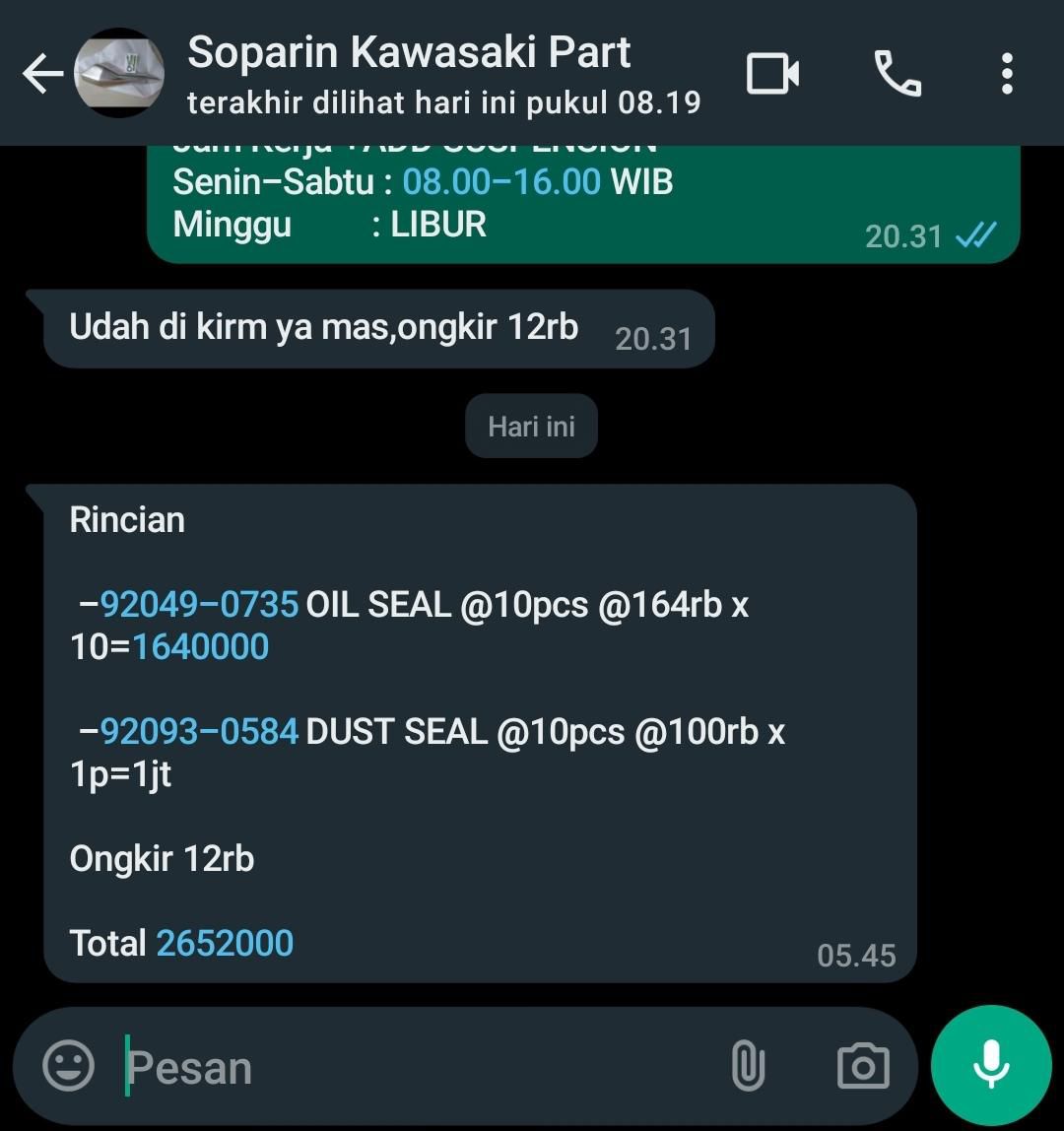 | 10 Pcs | KWSDS001 Dust Seal KX250/KX250F (2013-2019) - (Pcs) | Rp. 100,000 | Rp. 1,000,000 | - | - | Rp. 1,000,000 |