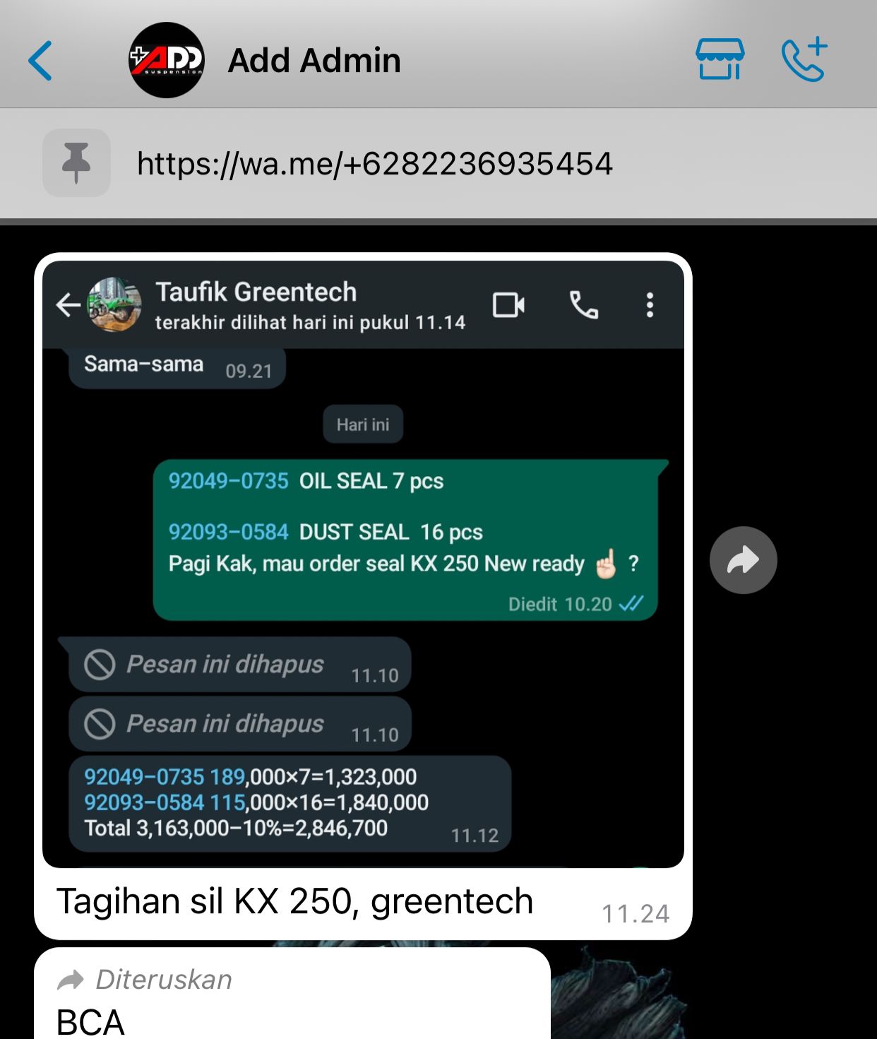 | 7 Pcs | KWSOS001 Oil Seal KX250/KX250F (2013-2019) - (Pcs) | Rp. 189,000 | Rp. 1,323,000 | 10 % | Rp. 132,300 | Rp. 1,190,700 |