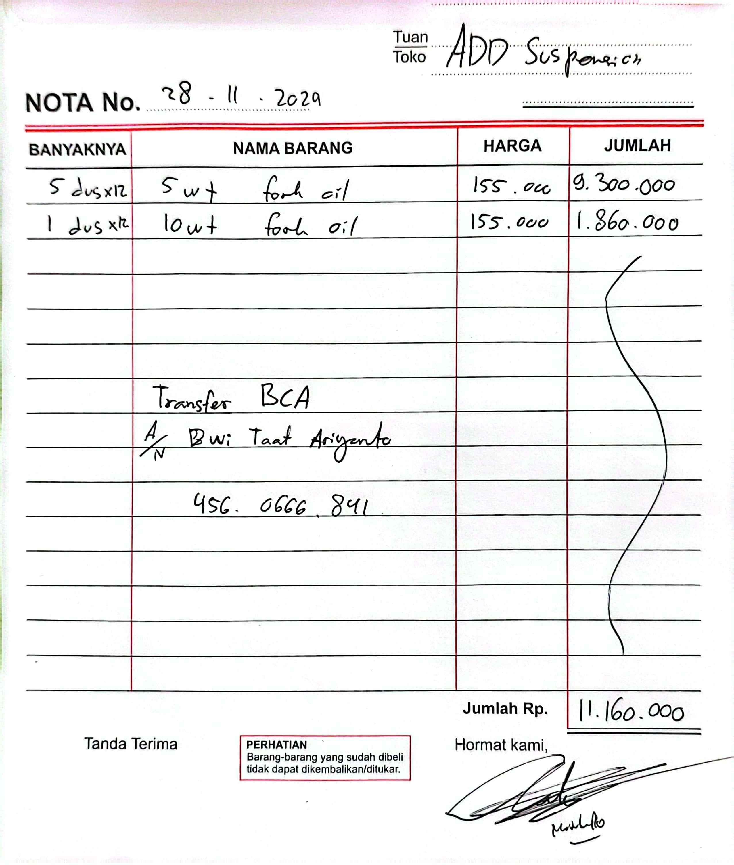 | 12 Pcs | CTXSL0002 Suspension Oil 10W 1L (Pcs) | Rp. 155,000 | Rp. 1,860,000 | - | - | Rp. 1,860,000 |