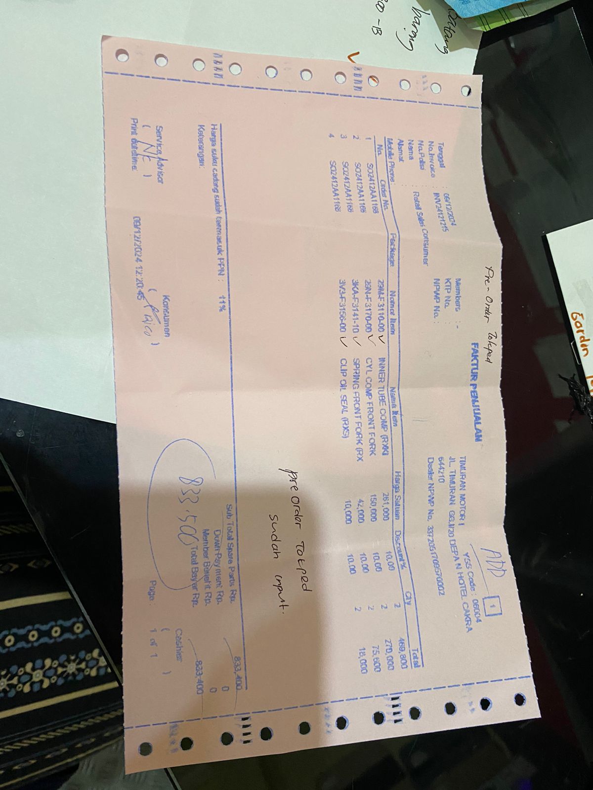 | 2 Pcs | YMHCCFF001 29 CYL COMP FRONT FORK - (Pcs) | Rp. 150,000 | Rp. 300,000 | 10 % | Rp. 30,000 | Rp. 270,000 |