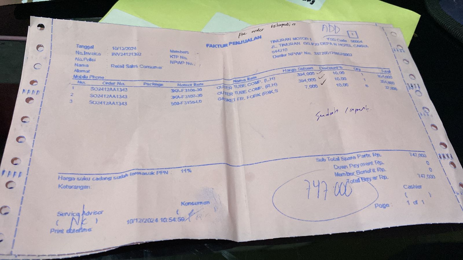 | 1 Sets | YMH3KAF310630 OUTER TUBE COMP. (L. H) - (Sets) | Rp. 394,000 | Rp. 394,000 | 10 % | Rp. 39,400 | Rp. 354,600 |