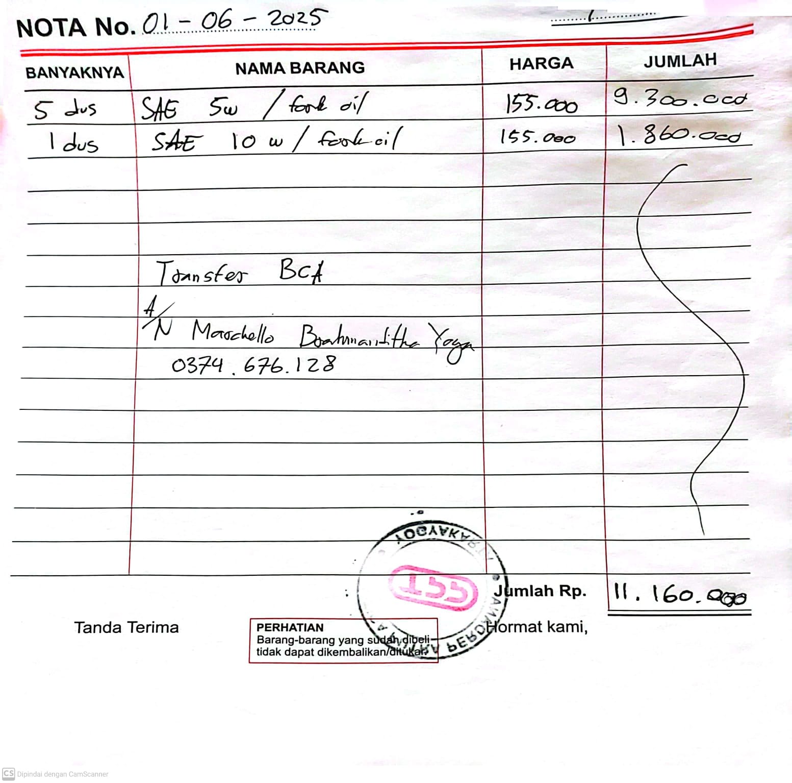 | 12 Pcs | CTXSL0002 Suspension Oil 10W 1L (Pcs) | Rp. 155,000 | Rp. 1,860,000 | - | - | Rp. 1,860,000 |