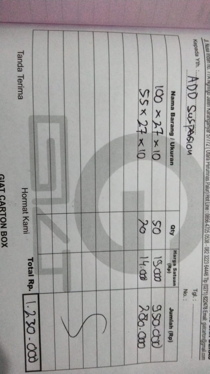 | 20 Pcs | ADDPAC002 Kardus 55 x 27 X 10 + Buble - (Pcs) | Rp. 14,000 | Rp. 280,000 | - | - | Rp. 280,000 |