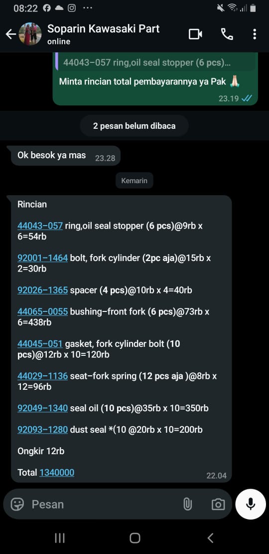 | 10 Pcs | ADDSDKL001 Seal debu KLX /Ninja 33 x 46,50 (Pcs) | Rp. 20,000 | Rp. 200,000 | - | - | Rp. 200,000 |