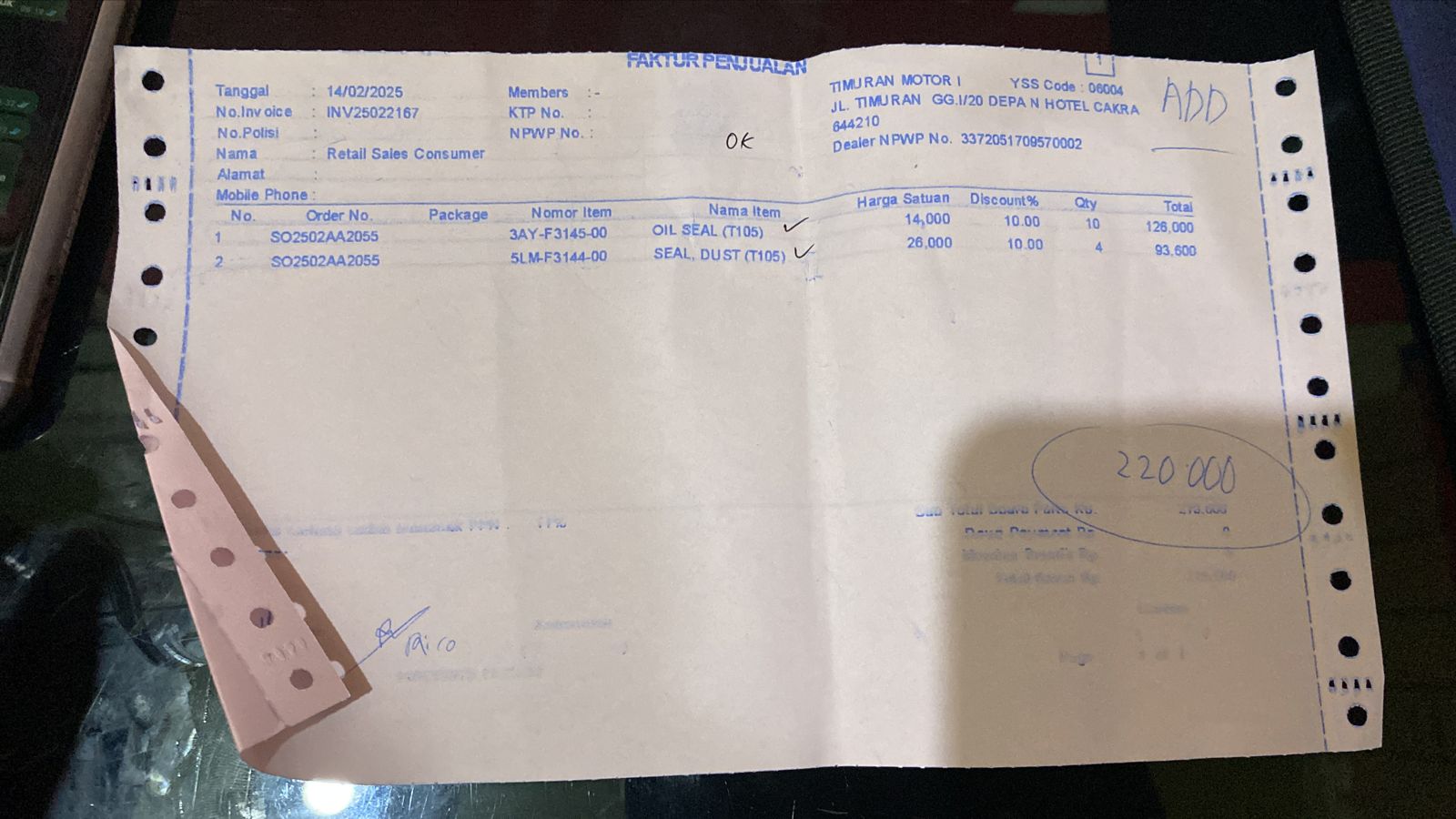 | 10 Pcs | YMHOS002 OIL SEAL (T105) - (Pcs) | Rp. 14,000 | Rp. 140,000 | 10 % | Rp. 14,000 | Rp. 126,000 |