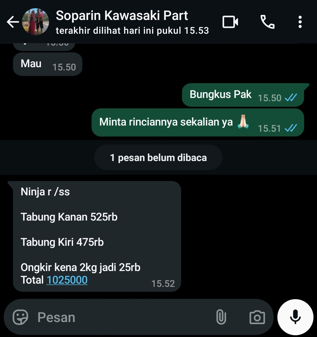 | 1 Pcs | KGPPCSF01 PIPE - COMP - SUSP, FORK OUT SILVER (RIGHT) (Pcs) | Rp. 523,000 | Rp. 523,000 | - | - | Rp. 523,000 |