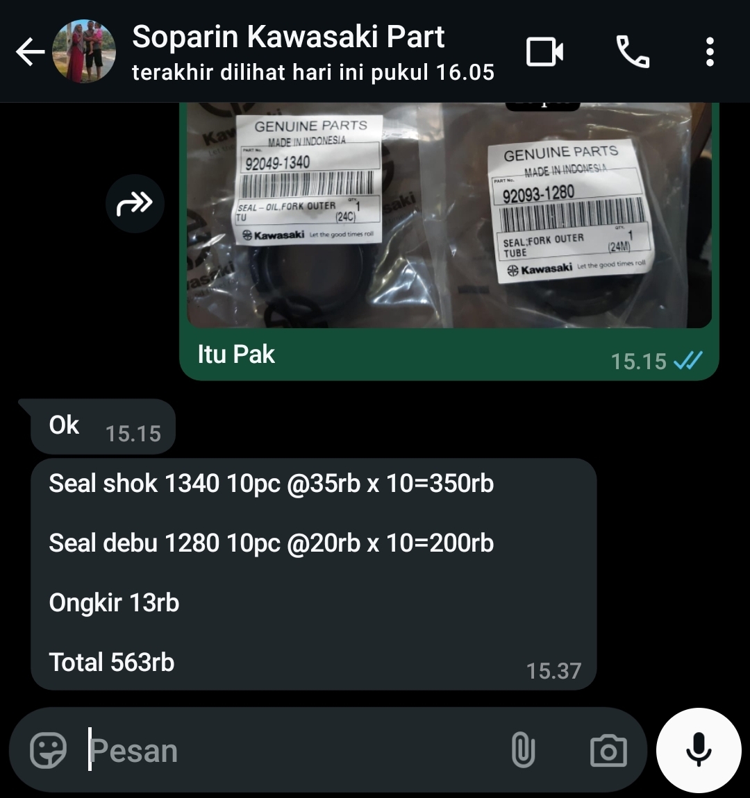 | 10 Pcs | ADDSDKL001 Seal debu KLX /Ninja 33 x 46,50 (Pcs) | Rp. 20,000 | Rp. 200,000 | - | - | Rp. 200,000 |
