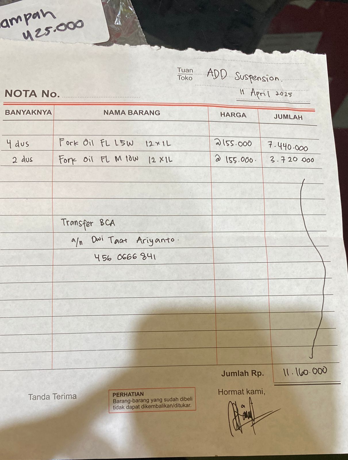 | 48 Pcs | CTXSL0001 Suspension Oil 5W 1L (Pcs) | Rp. 155,000 | Rp. 7,440,000 | - | - | Rp. 7,440,000 |