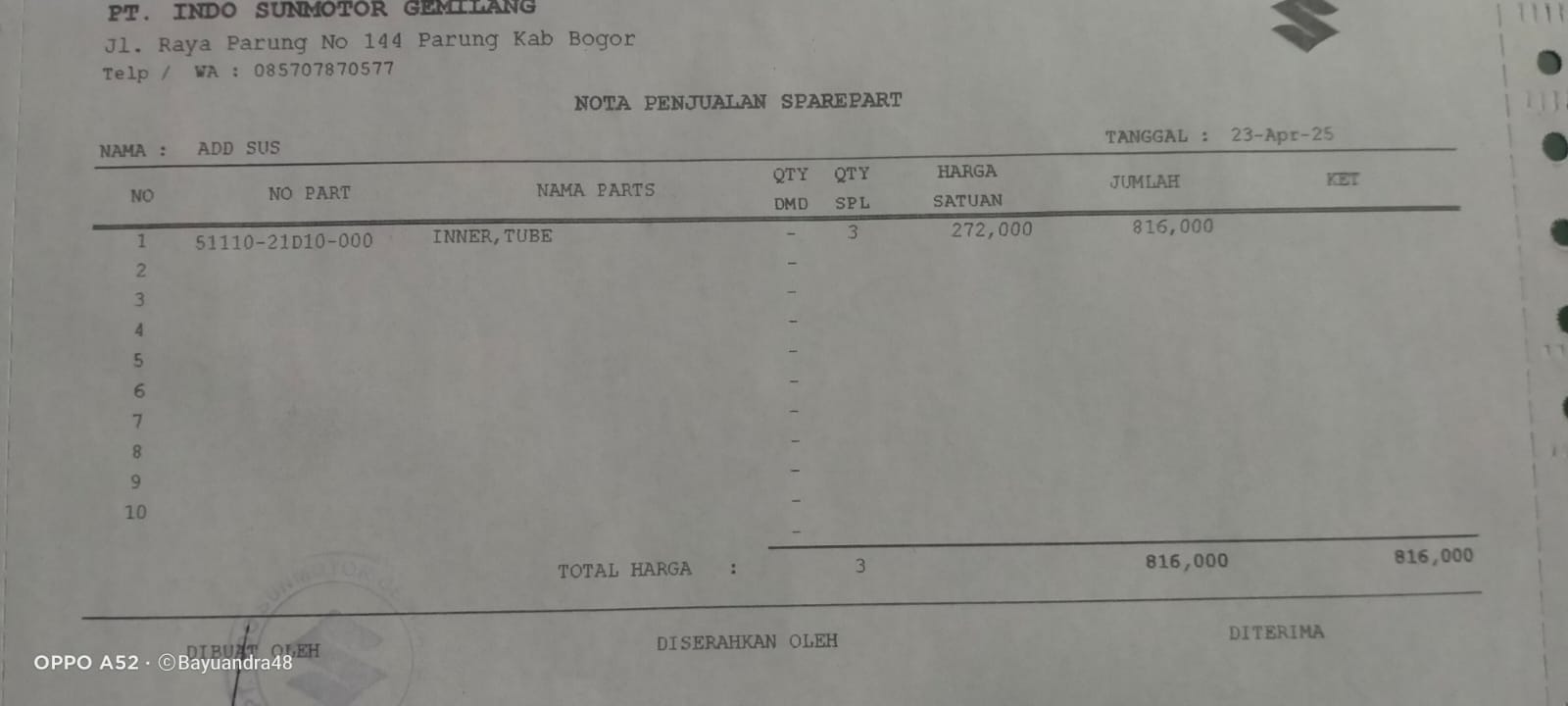 | 3 Pcs | SGPIT001 INNER, TUBE - (Pcs) | Rp. 272,000 | Rp. 816,000 | - | - | Rp. 816,000 |