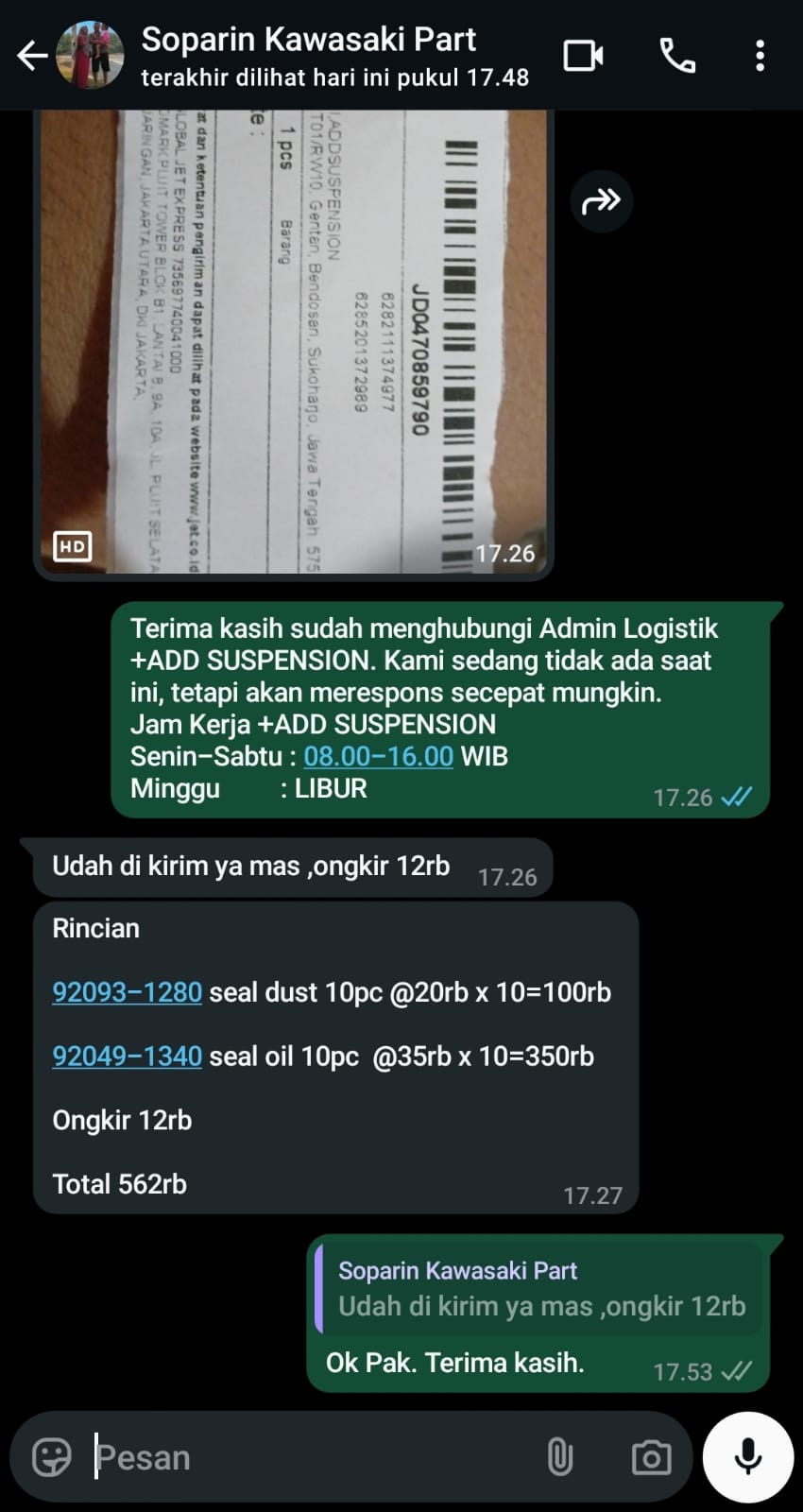 | 10 Pcs | ADDSDKL001 Seal debu KLX /Ninja 33 x 46,50 (Pcs) | Rp. 20,000 | Rp. 200,000 | - | - | Rp. 200,000 |