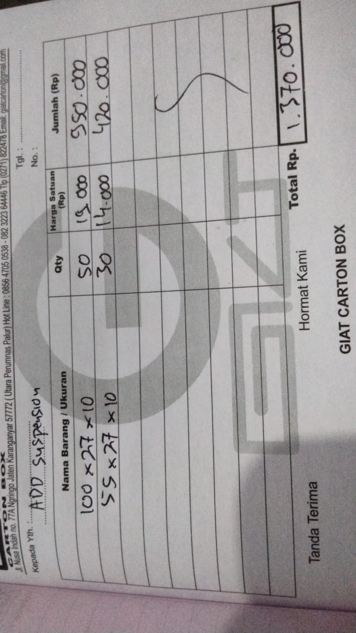| 50 Pcs | ADDPAC002 Kardus 55 x 27 X 10 + Buble - (Pcs) | Rp. 14,000 | Rp. 700,000 | - | - | Rp. 700,000 |