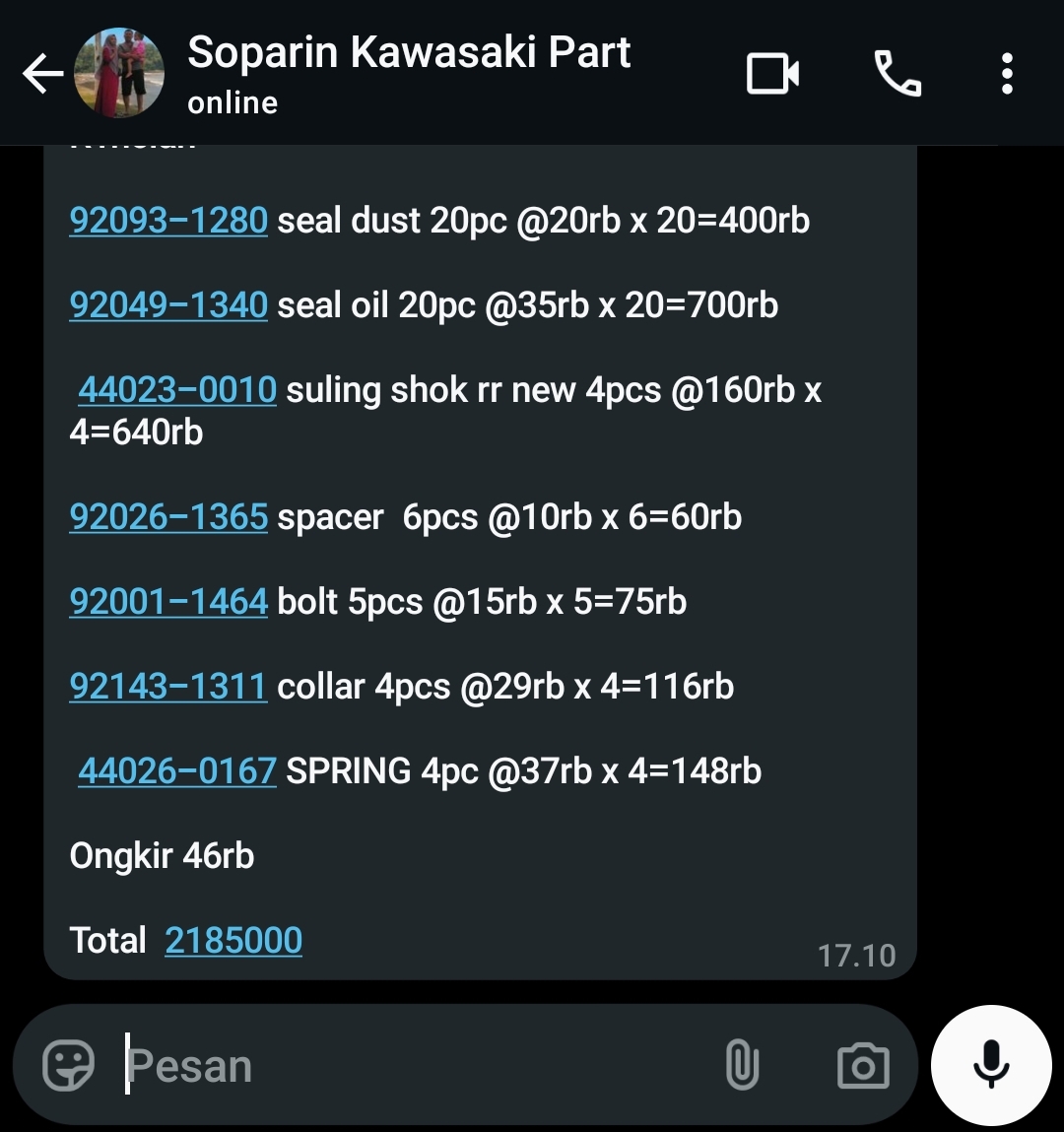 | 4 Pcs | KWSKS001 SPRING - FRONT FORK Ninja-150 RR (Pcs) | Rp. 37,000 | Rp. 148,000 | - | - | Rp. 148,000 |