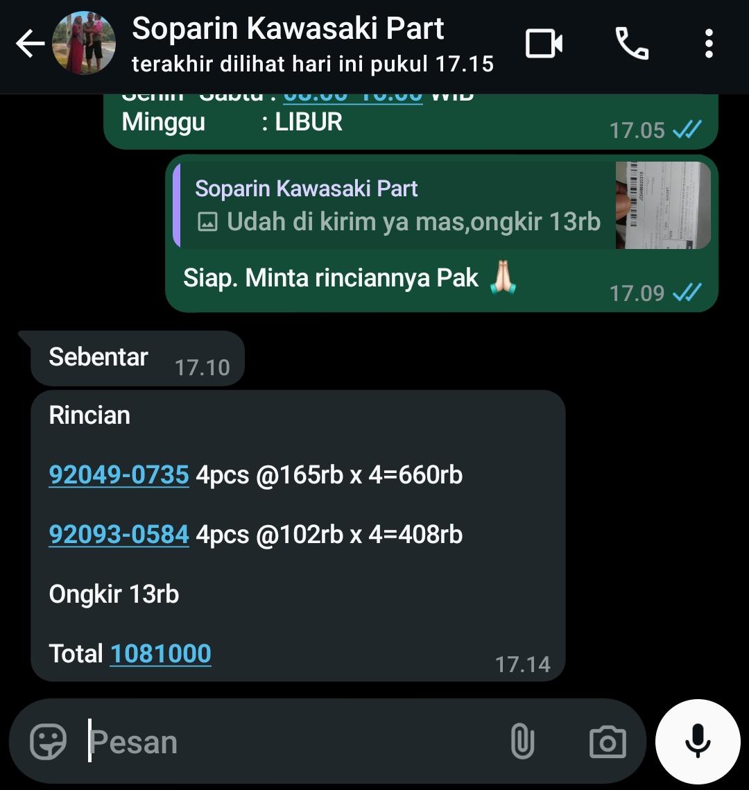 | 4 Pcs | KWSOS001 Oil Seal KX250/KX250F (2013-2019) - (Pcs) | Rp. 165,000 | Rp. 660,000 | - | - | Rp. 660,000 |