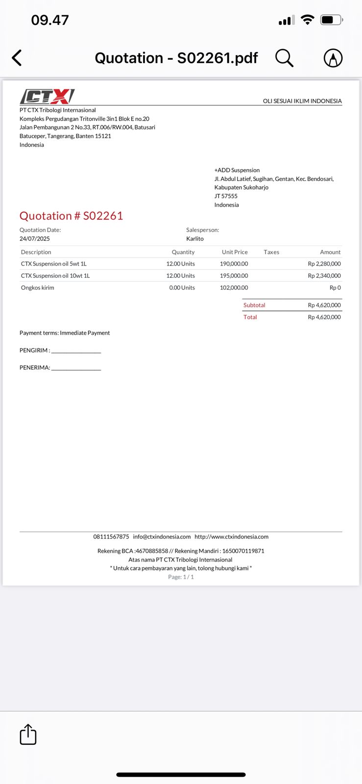 | 12 Pcs | CTXSL0002 Suspension Oil 10W 1L (Pcs) | Rp. 190,000 | Rp. 2,280,000 | - | - | Rp. 2,280,000 |