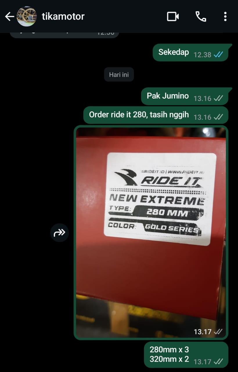 | 2 Sets | RISGH001 Ride IT GP 299 320mm (single klik ) STD (Sets) | Rp. 1,460,000 | Rp. 2,920,000 | - | - | Rp. 2,920,000 |