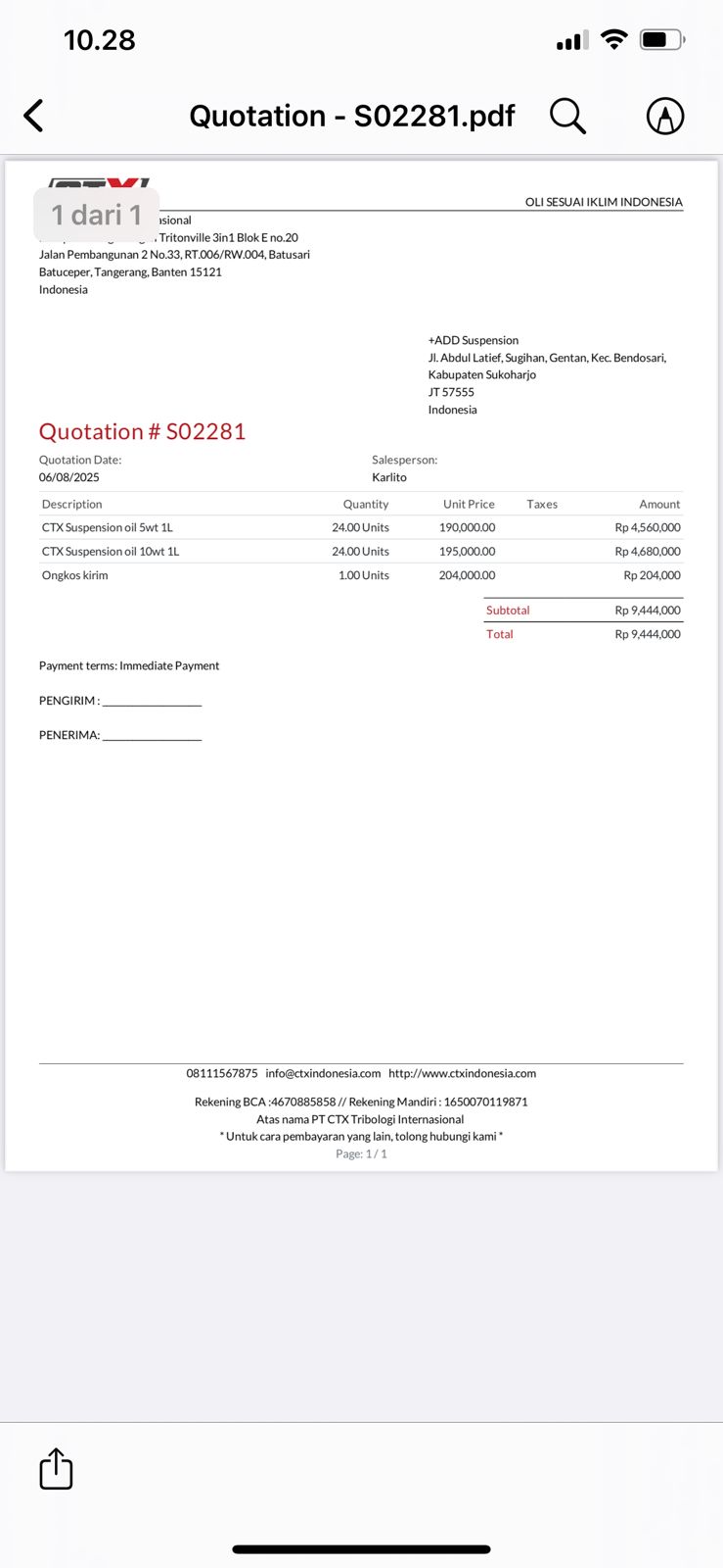 | 24 Pcs | CTXSL0001 Suspension Oil 5W 1L (Pcs) | Rp. 195,000 | Rp. 4,680,000 | - | - | Rp. 4,680,000 |