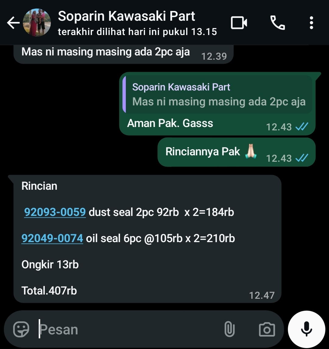 | 2 Pcs | ADDDSKX250 Dust Seal USD KX 250 - (Pcs) | Rp. 92,000 | Rp. 184,000 | - | - | Rp. 184,000 |