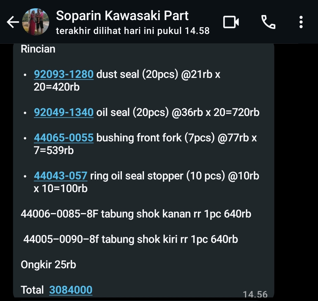 | 20 Pcs | ADDSDKL001 Seal debu KLX /Ninja 33 x 46,50 (Pcs) | Rp. 21,000 | Rp. 420,000 | - | - | Rp. 420,000 |