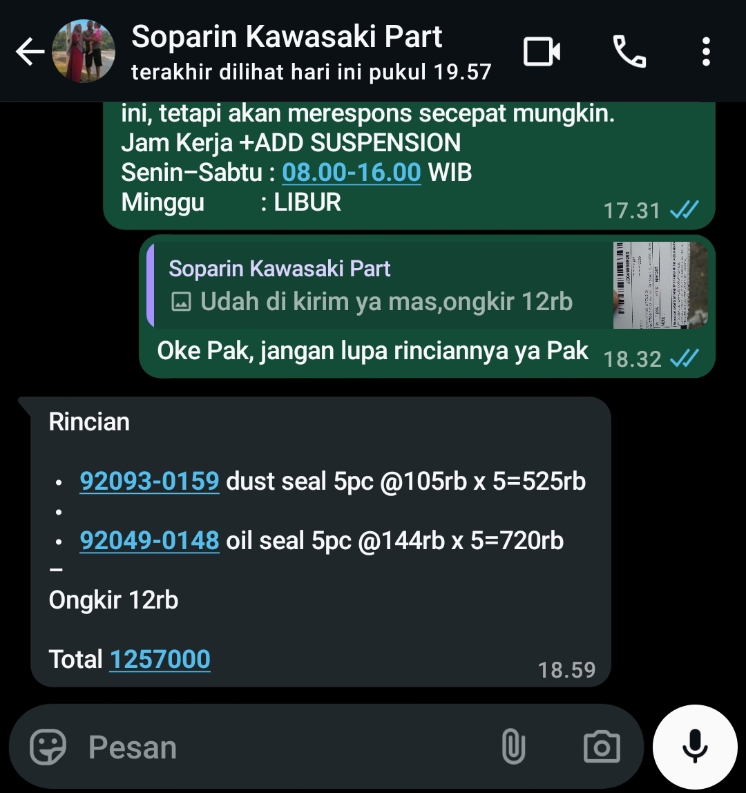 | 5 Pcs | ADDSOU001 Oil Seal USD D-Tracker / KLX BF 35 x 48 x 11 (Pcs) | Rp. 144,000 | Rp. 720,000 | - | - | Rp. 720,000 |