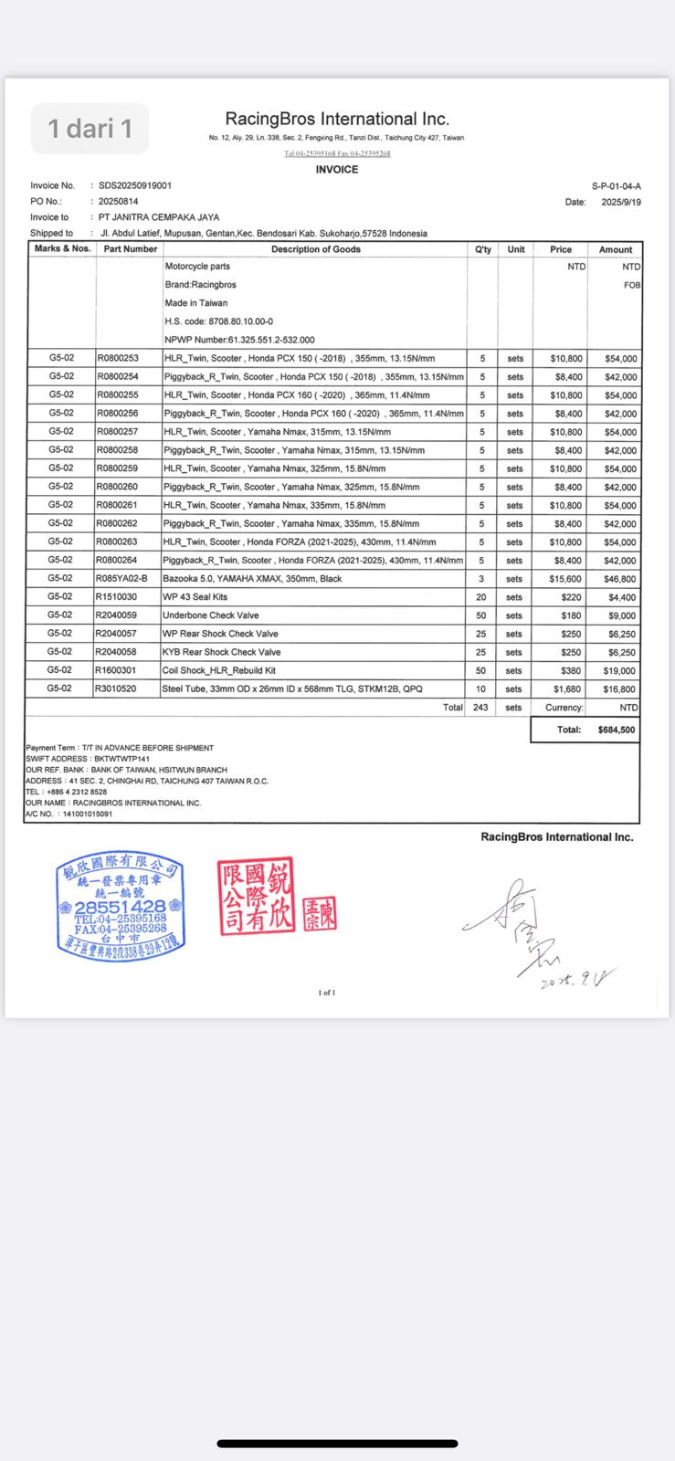 Racing bros International Inc 41 SEC.2 ,CHINGHAI RD, TAICHUNG 407 TAIWAN R.O.C ,