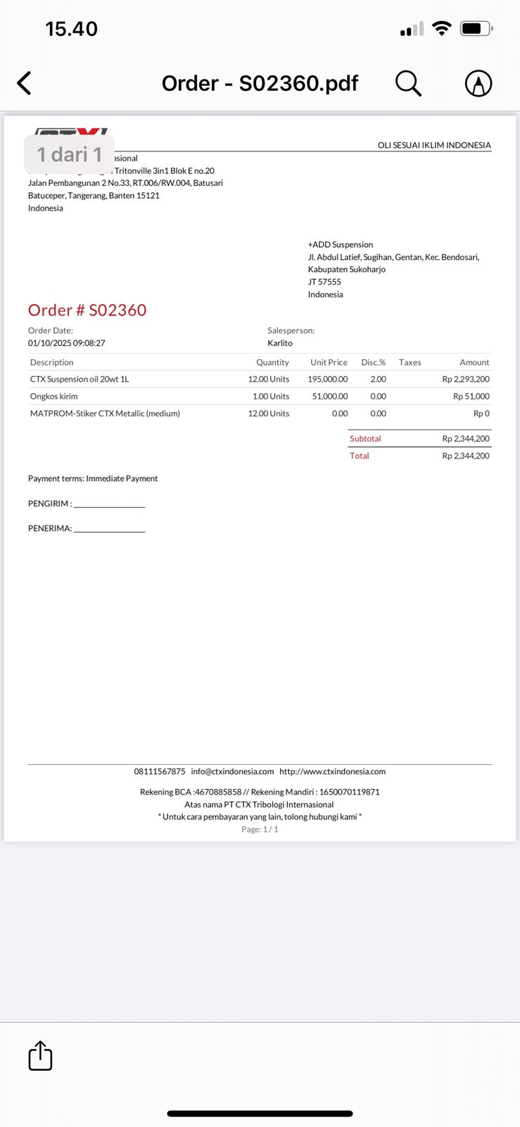 12 PcsCTXOL001 Suspension Oil 20WT 1L (Pcs)Rp. 195,000Rp. 2,340,0002 %Rp. 46,800Rp. 2,293,200