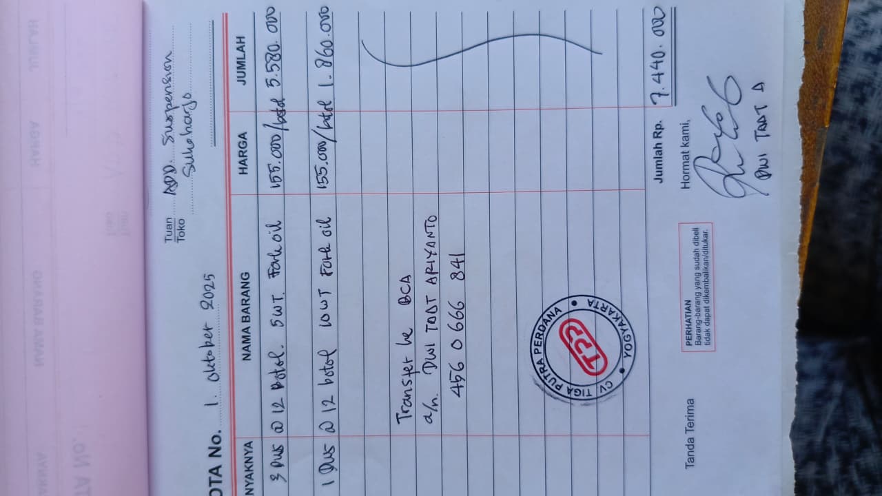 | 36 Pcs | CTXSL0001 Suspension Oil 5W 1L (Pcs) | Rp. 155,000 | Rp. 5,580,000 | - | - | Rp. 5,580,000 |