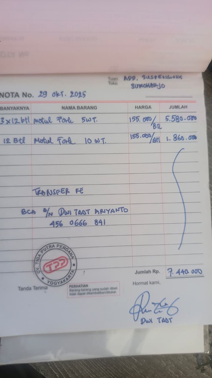 12 PcsCTXSL0002 Suspension Oil 10W 1L (Pcs)Rp. 155,000Rp. 1,860,000--Rp. 1,860,000