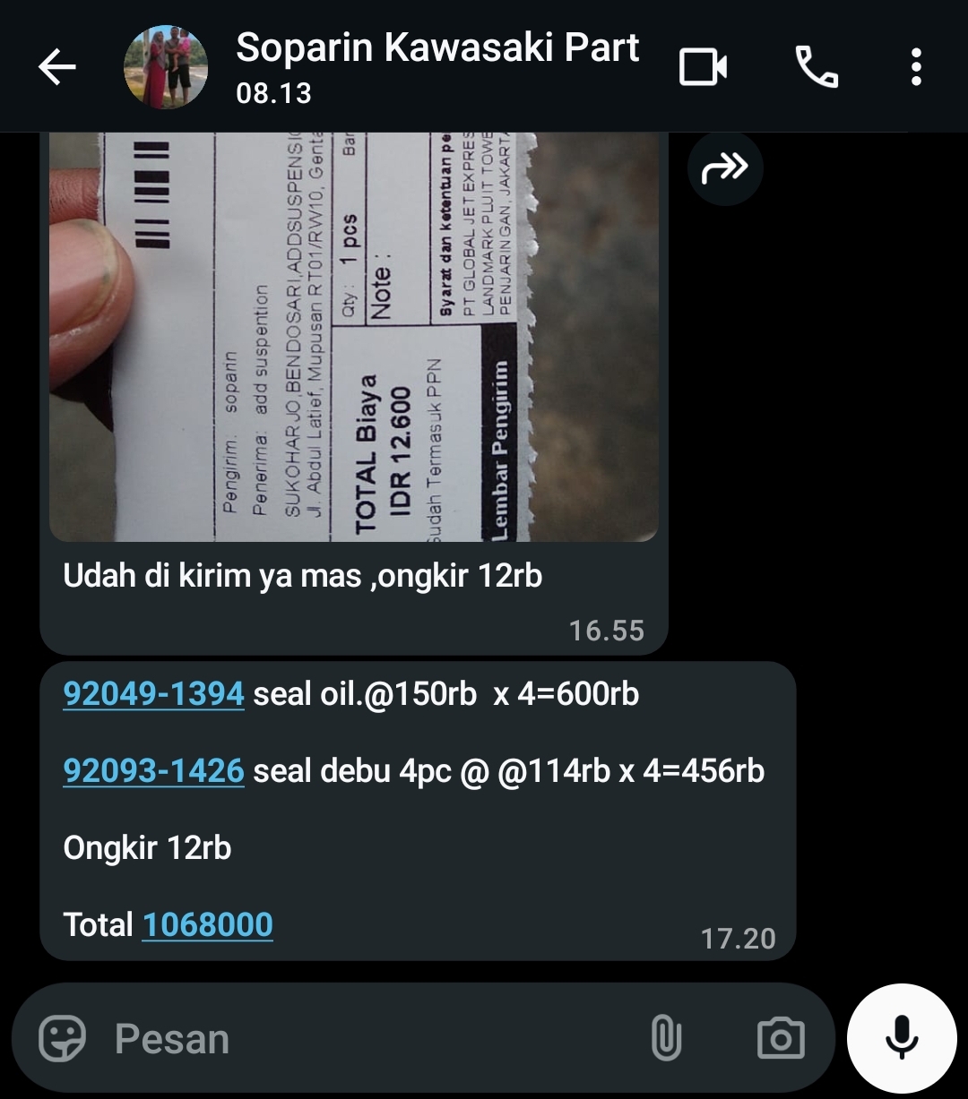 | 4 Pcs | KGP920491394 SEAL-OIL, FORK OUTER TUBE KX85 (Pcs) | Rp. 150,000 | Rp. 600,000 | - | - | Rp. 600,000 |