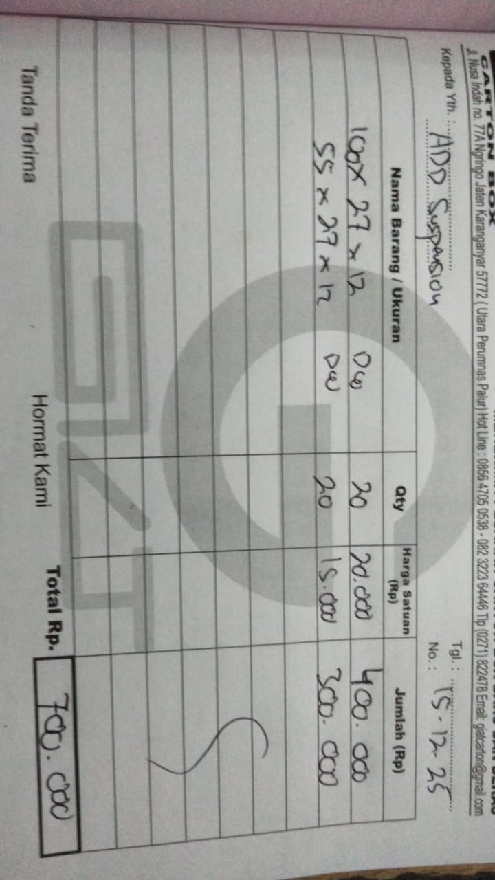 | 20 Pcs | ADDPAC002 Kardus 55 x 27 X 10 + Buble - (Pcs) | Rp. 15,000 | Rp. 300,000 | - | - | Rp. 300,000 |