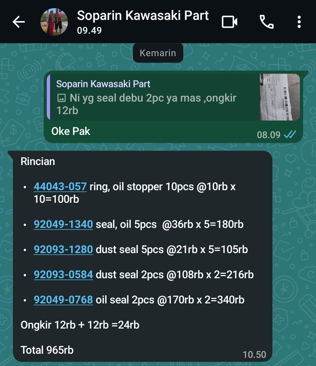 | 2 Pcs | KWSOSKX450 OIL SEAL - (Pcs) | Rp. 170,000 | Rp. 340,000 | - | - | Rp. 340,000 |