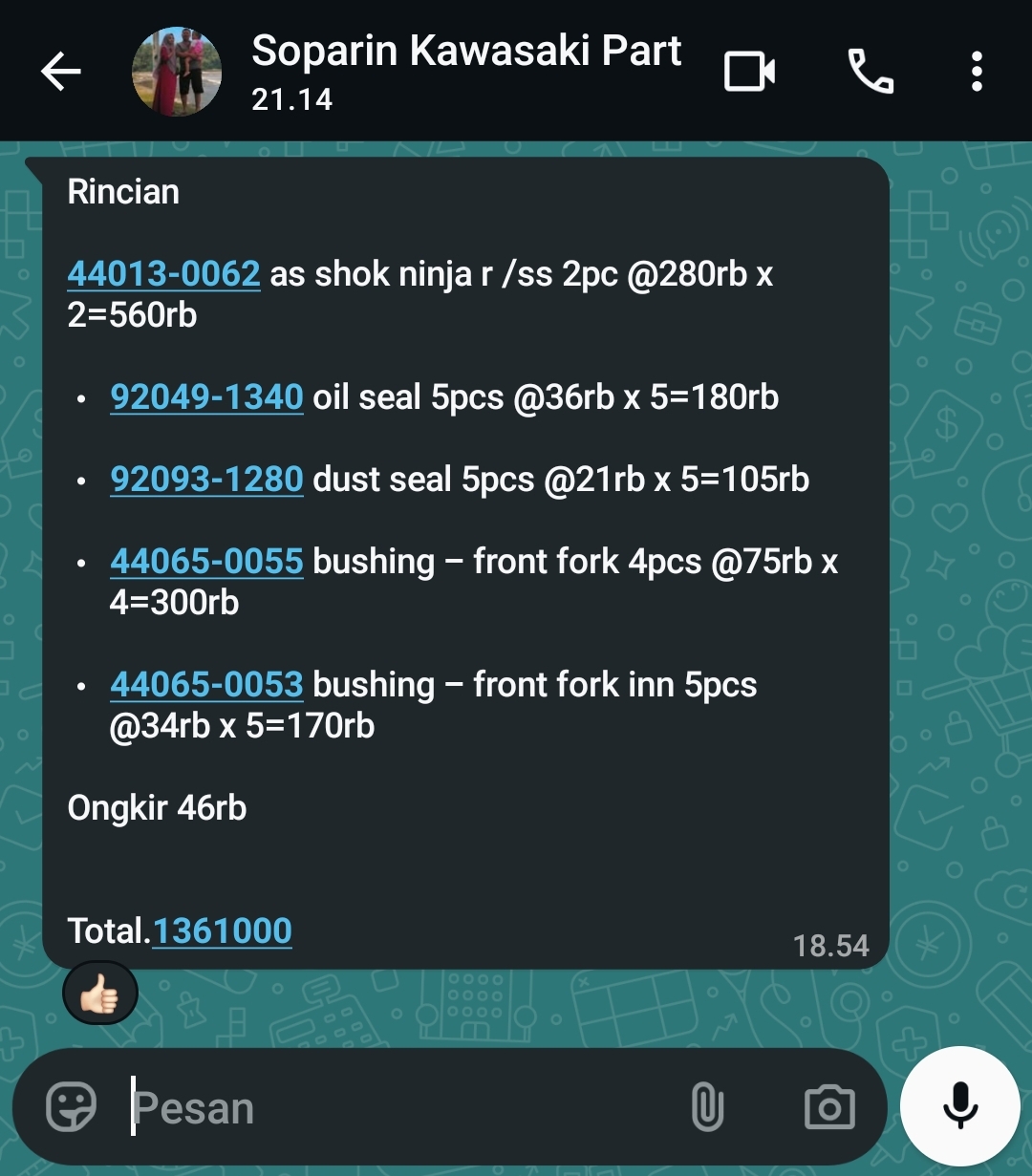 | 5 Pcs | ADDSDKL001 Seal debu KLX /Ninja 33 x 46,50 (Pcs) | Rp. 21,000 | Rp. 105,000 | - | - | Rp. 105,000 |
