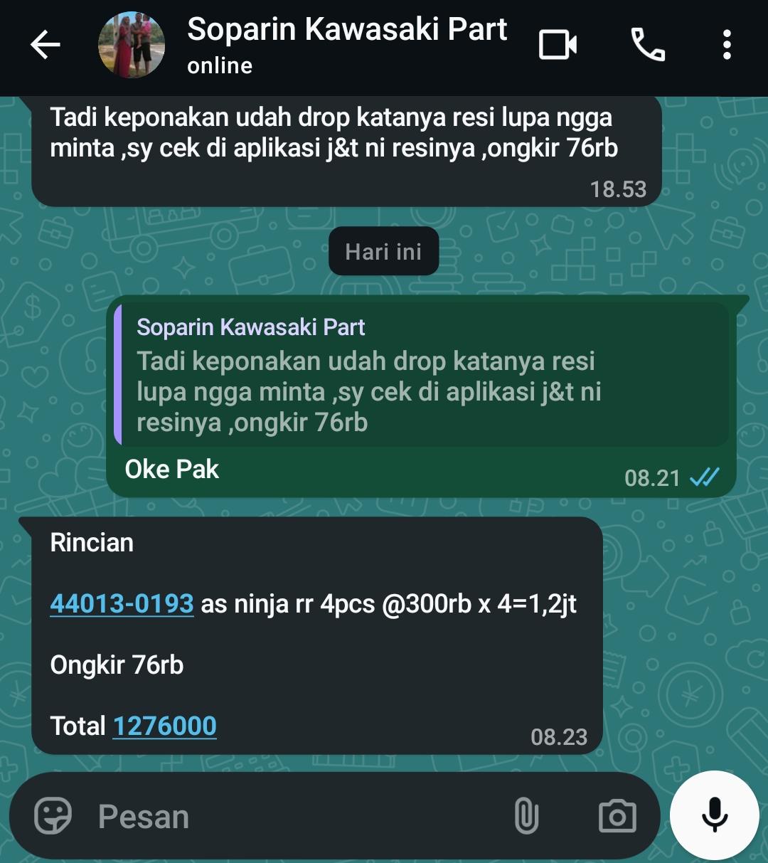 | 4 Pcs | KGP440130193 PIPE - FORK INNER Ninja-150 RR (Pcs) | Rp. 300,000 | Rp. 1,200,000 | - | - | Rp. 1,200,000 |