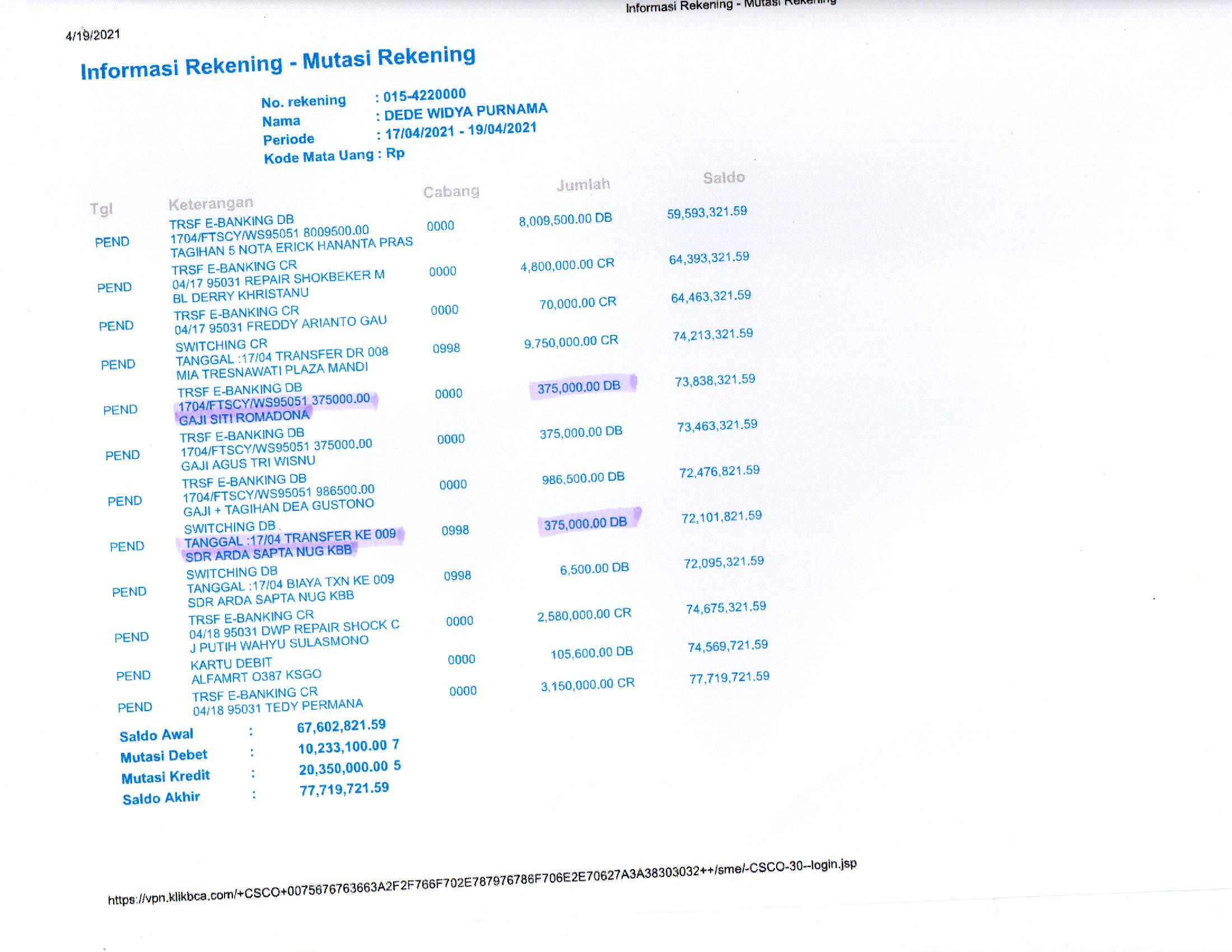 | 1 | 17-04-2021 16:00 | PELUNASAN | Rp. 375,000 | Rp. 0 | Rp. 375,000 | Download |